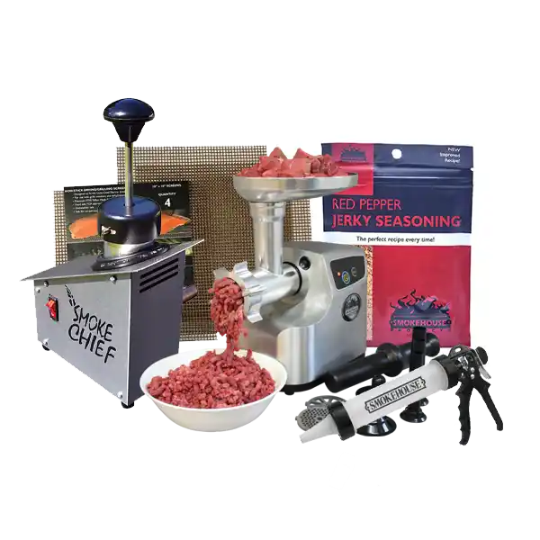 For those who want the complete jerky-making experience, the Ultimate Jerky Master Kit is a must-have. This comprehensive package includes a Smoke Chief for infusing your jerky with authentic smoky flavors, along with the powerful meat grinder, jerky gun, and drying/grilling screens found in Package A. Elevate your flavors with Red Pepper Seasoning and Jerky Brine Mix, and enjoy professional-quality jerky made right at home. This kit is designed for serious jerky lovers who want to take their craft to the next level.